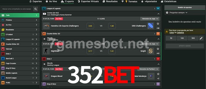 O 352Bet oferece uma grande seleção de opções de apostas em e-sports com probabilidades competitivas